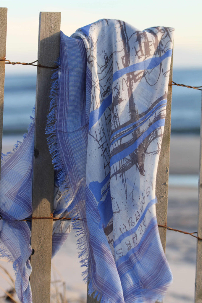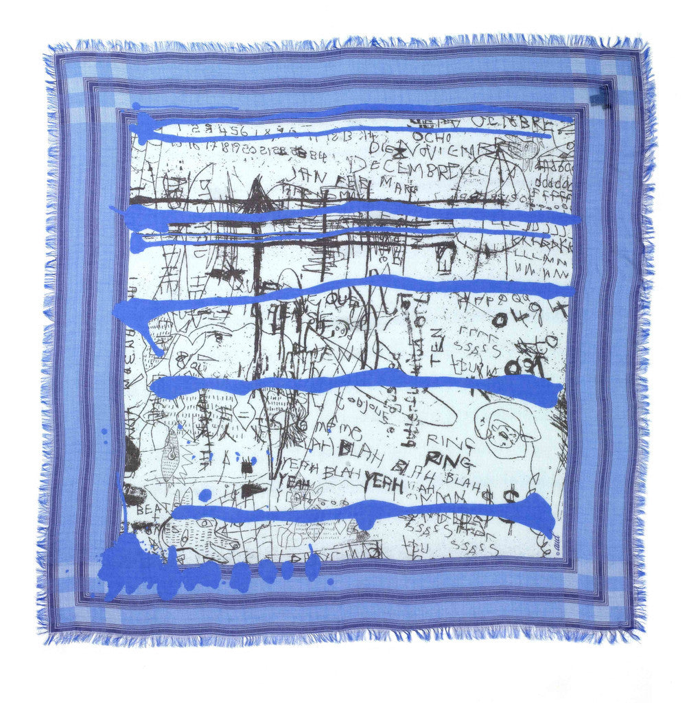Blah Blah print on a lightweight modal cashmere. An ethereal graffiti print in blue. Square scarf with hand frayed edges .